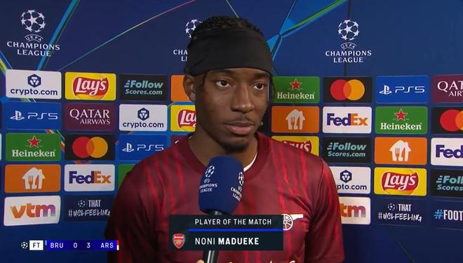欧冠联赛阶段第6轮一场较量,阿森纳客场3-0完胜布鲁日。赛后,梅开二度的马杜埃凯接受了TNT体育的采访。