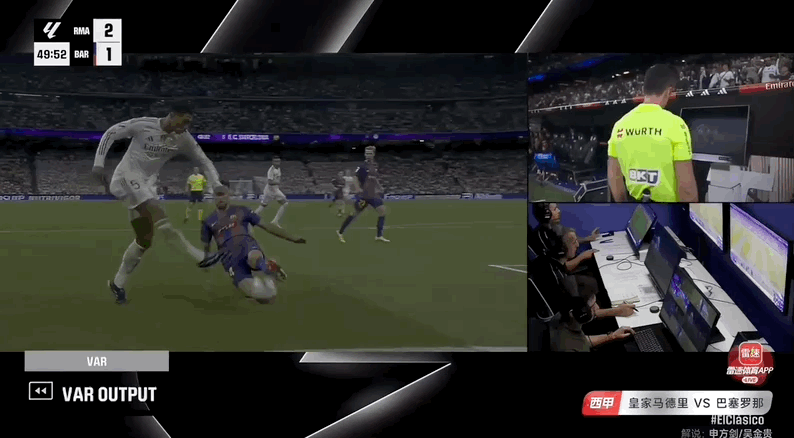 雷速体育10月29日讯 据西班牙《马卡报》报道,在最新一期的官方裁判分析节目《回放时刻》中,西班牙裁判委员会对上周末皇马与巴萨的国家德比做出解读:视频助理裁判(VAR)在比赛中两次关键介入均完全正确,成功纠正了主裁判的明显误判,确保了比赛结果的公正性。